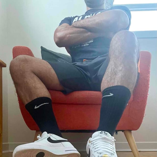 Muscled guy addicted to sneakers and boots